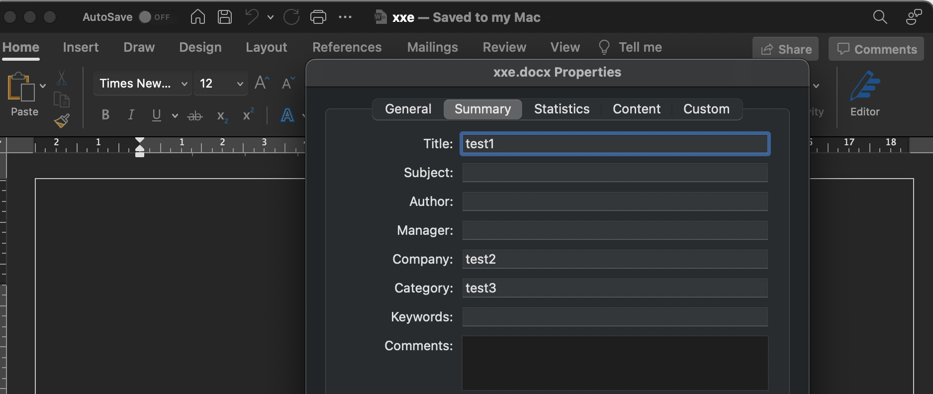 unzip xxe.docxgrep -nr 'test1*' .-> dc:titletest1</dc:title>injection: